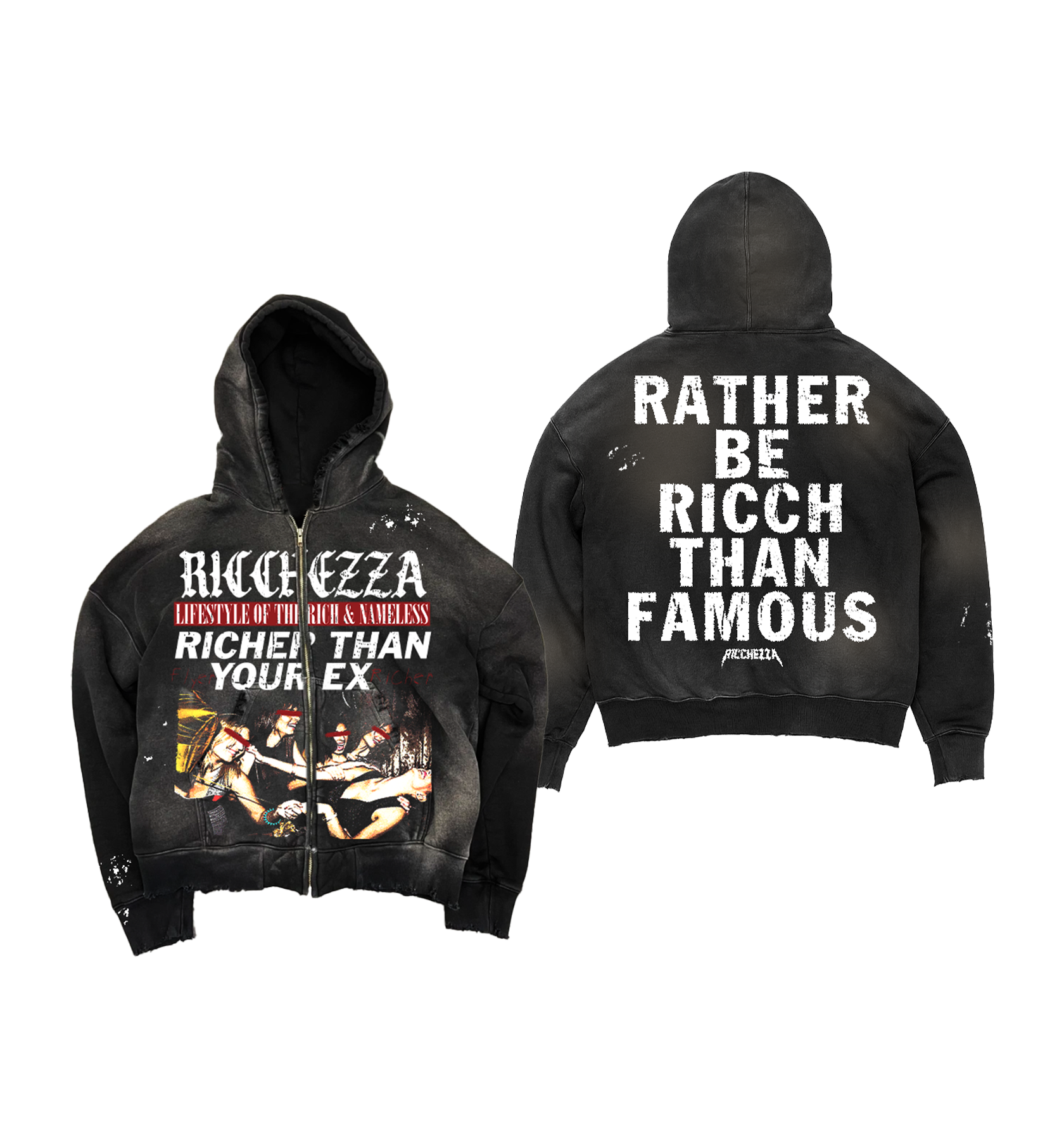 Hand Printed "Rather be Ricch Than Famous" graphic print on the back